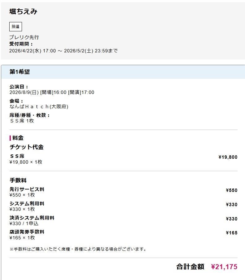 お友達が、行きたいと言うので、申し込んだけど、第一希望から第三希望まで、申し込みできるんだけど、どちらにしても抽選なんかないから第一希望で辞めた。友達が、高いなって言ってた。1番安い席にしたけど11000円で、ドリンクやら手数料やらで13000円位かかるなぁやはり高いから辞めようかな?あと1人の友達は辿々しいから可哀想で、辞めとくだって。11000円で後ろや二階席だと嫌だなぁ。